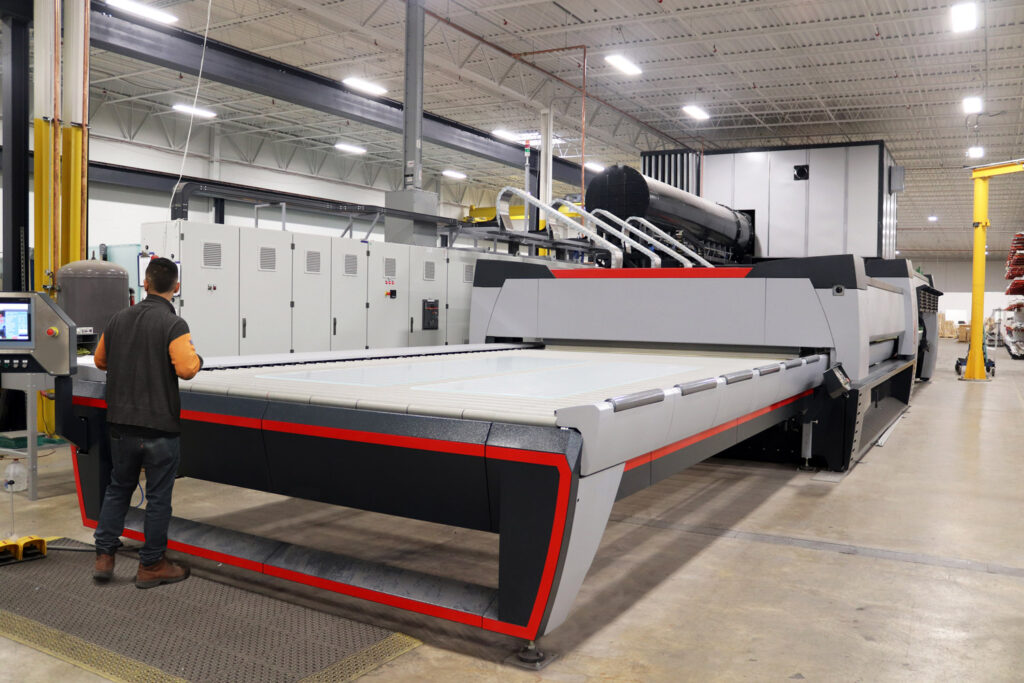 Equipped with a dynamic cutting head, our water-jet allows precision-cutting of curves and corners of any glass thickness. In addition to glass, the water jet cuts metal, stone, and composite materials, allowing us to offer a virtually limitless variety of custom decorative laminated glass.