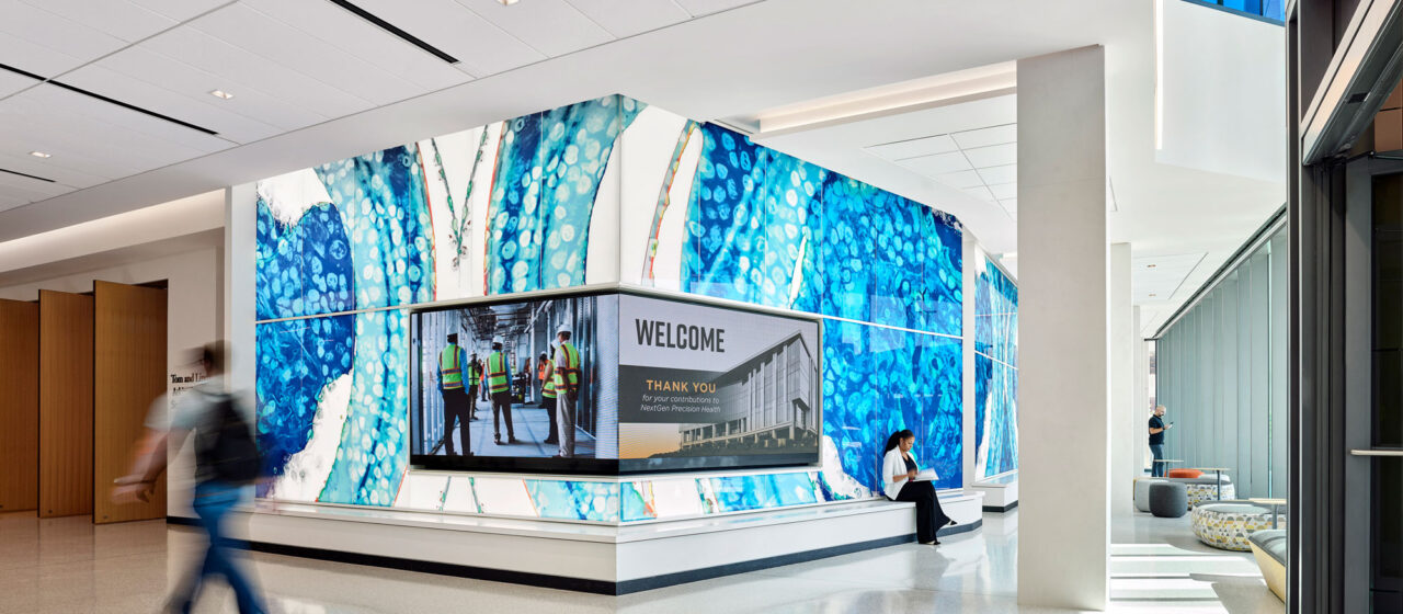 While providing a complete technical infrastructure for backlit applications, the TurnKey Fusion Light Wall System also meets’ designers’ needs for aesthetic flexibility.  The entire attachment system requires minimal space, standing only 2 1/16” from the wall, thus preserving room for other design objectives. TurnKey Fusion Light can be used to mount any kind of interior glass cladding from our extensive interior portfolio, including etched, textured, laminated, or digitally printed glass or dry-erase glass marker boards as well as LE’Diffusion glass. If building systems behind the glass need to be serviced, or if future needs change, the glass panels can be demounted with ease.