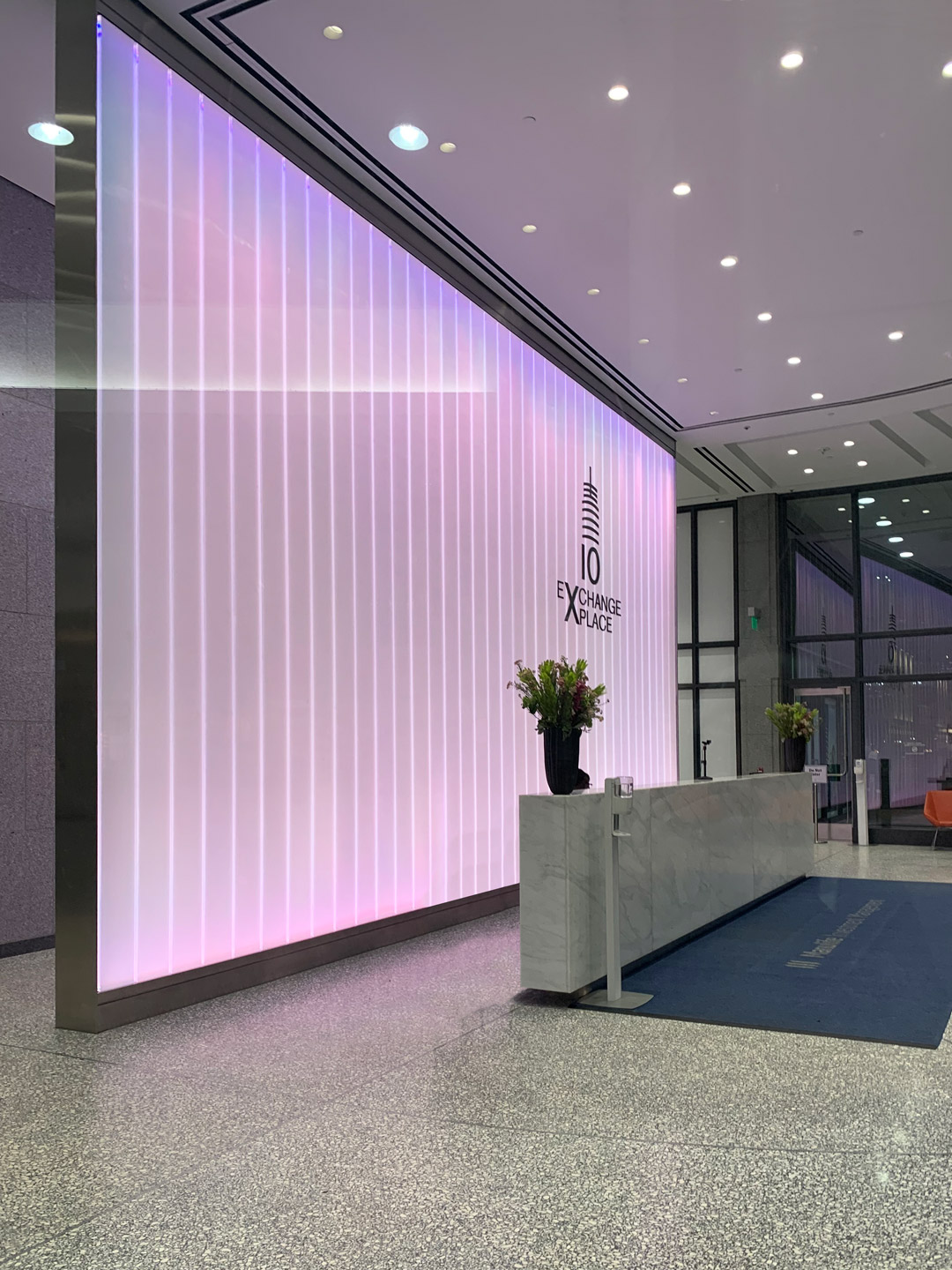 Two parallel single-glazed channel glass walls by Bendheim greet occupants as they enter this contemporary office building. The glass features the Houdini™ micro-fluted textured, adding a dynamic quality to the glass as light travels across it and the occupant’s view of the glass changes, and the channels are colored with a white frit. The walls are lit with LED lighting, and the texture and the frit of the glass make the walls glow.