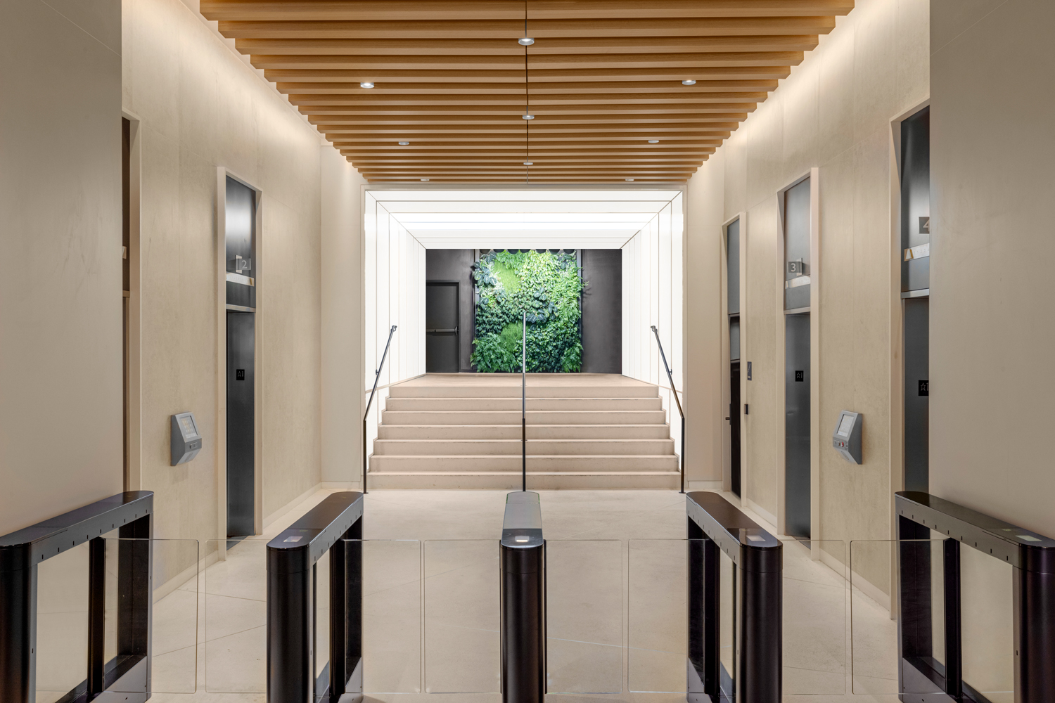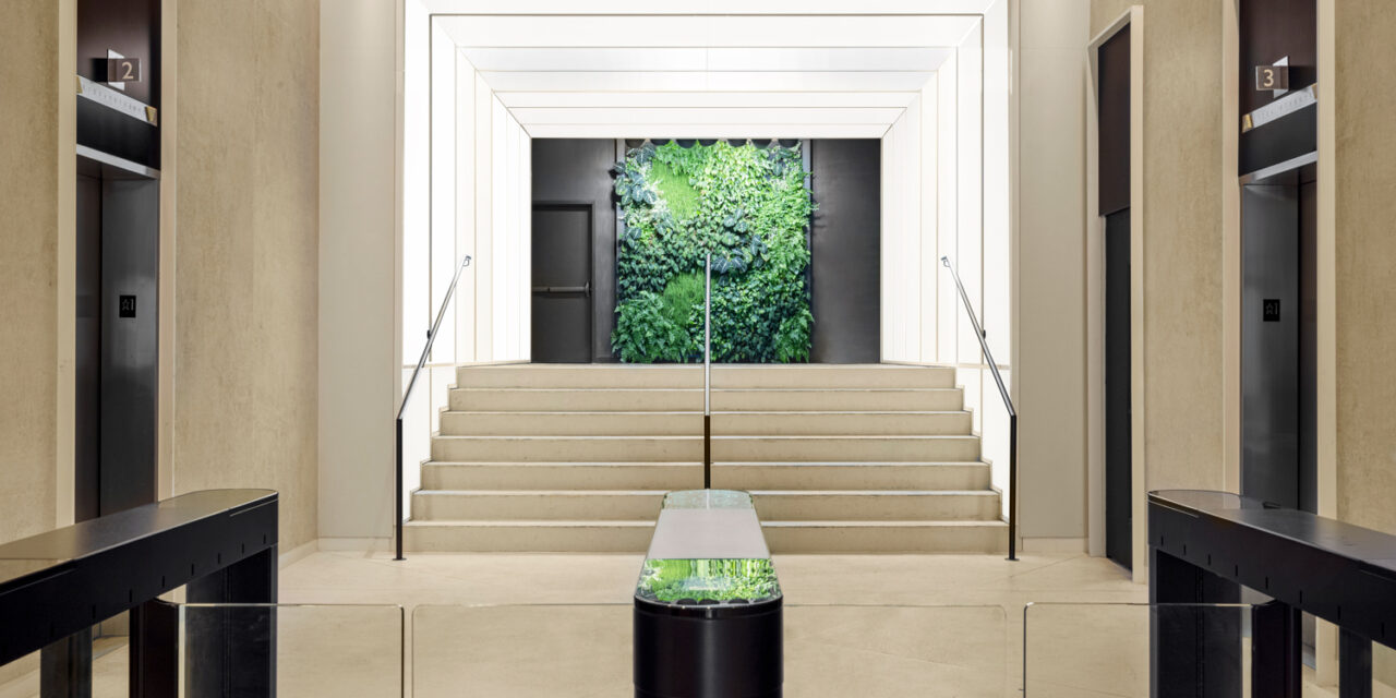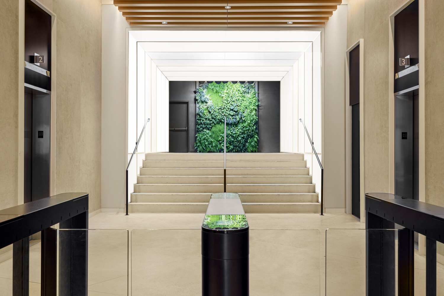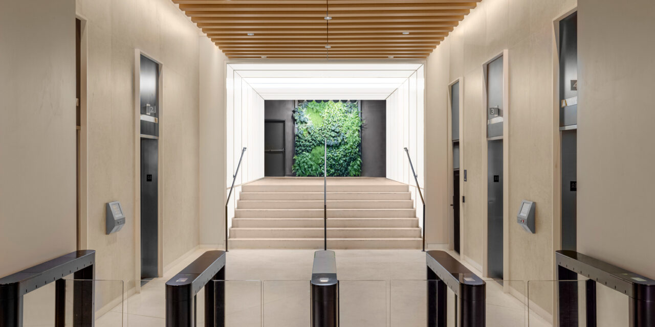 Past the turnstiles in the lobby of this historic office building, Bendheim’s TurnKey™ glass cladding system welcomes occupants as they traverse through the lobby. The system, which seamlessly transitions from the walls to the ceiling, clads the stairs and walkway with both glass and LED light panels. The translucent white glass evenly distributes the light panels without any shadow lines.