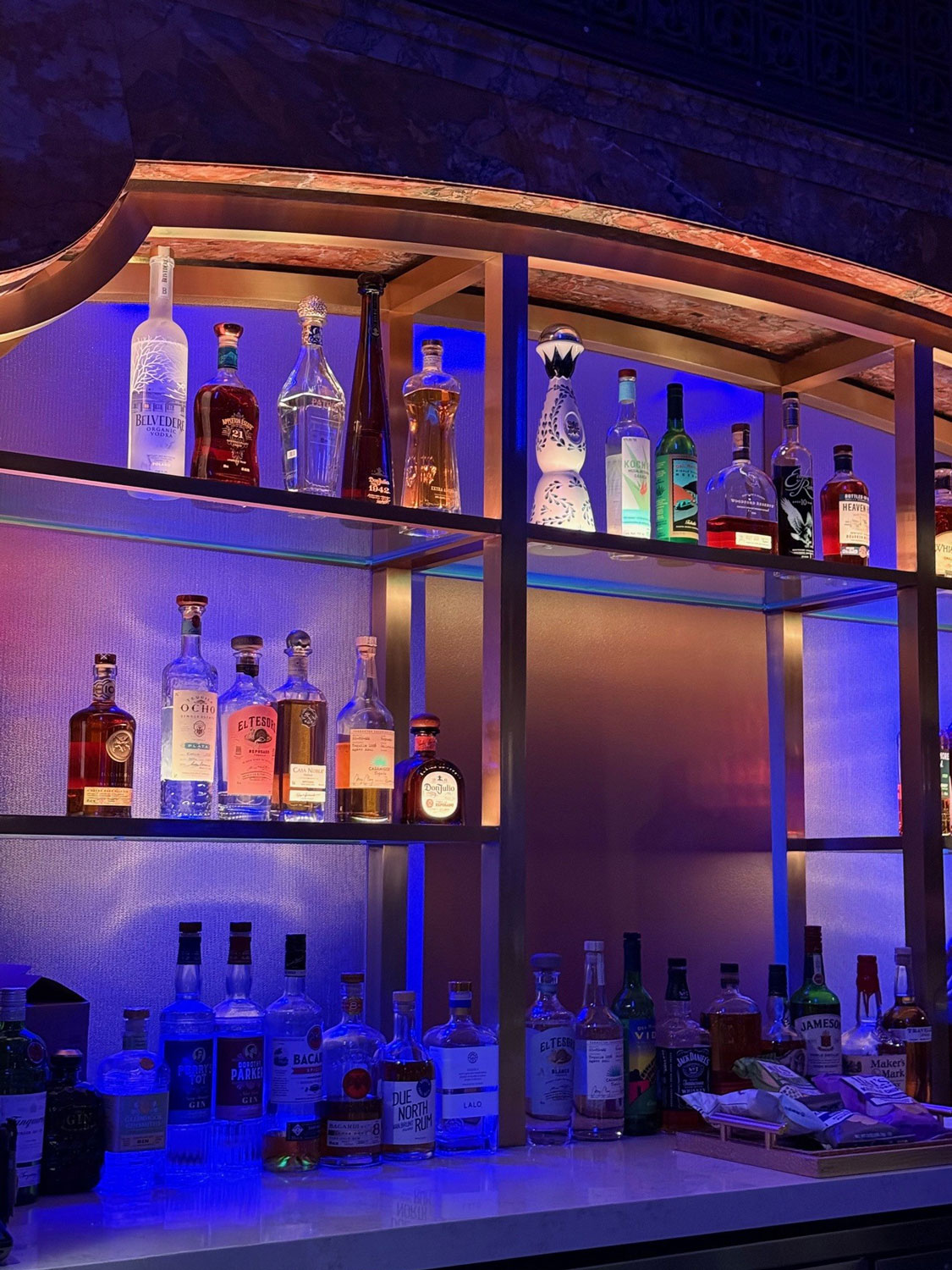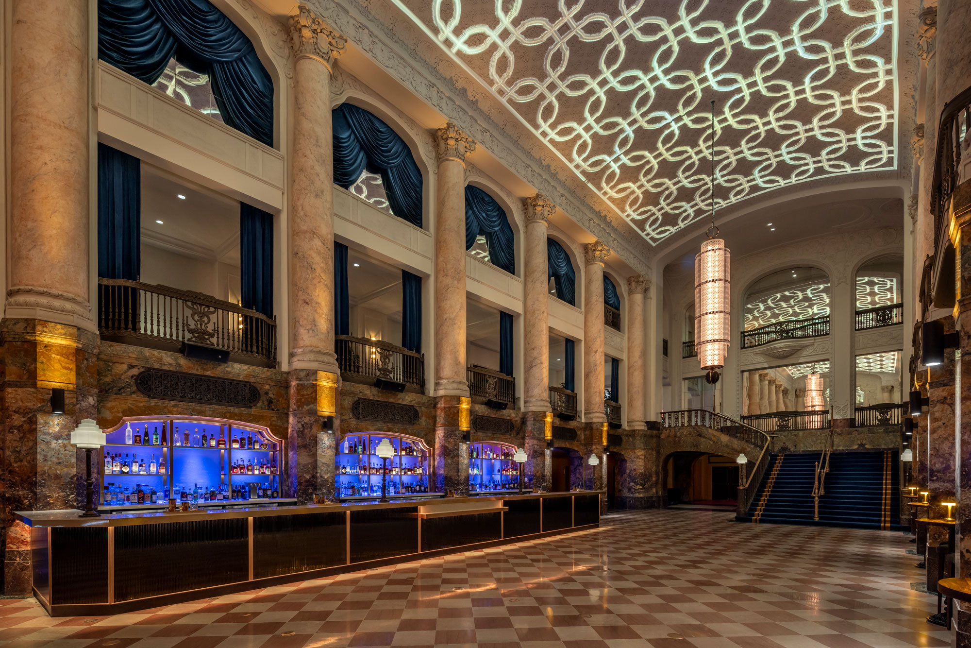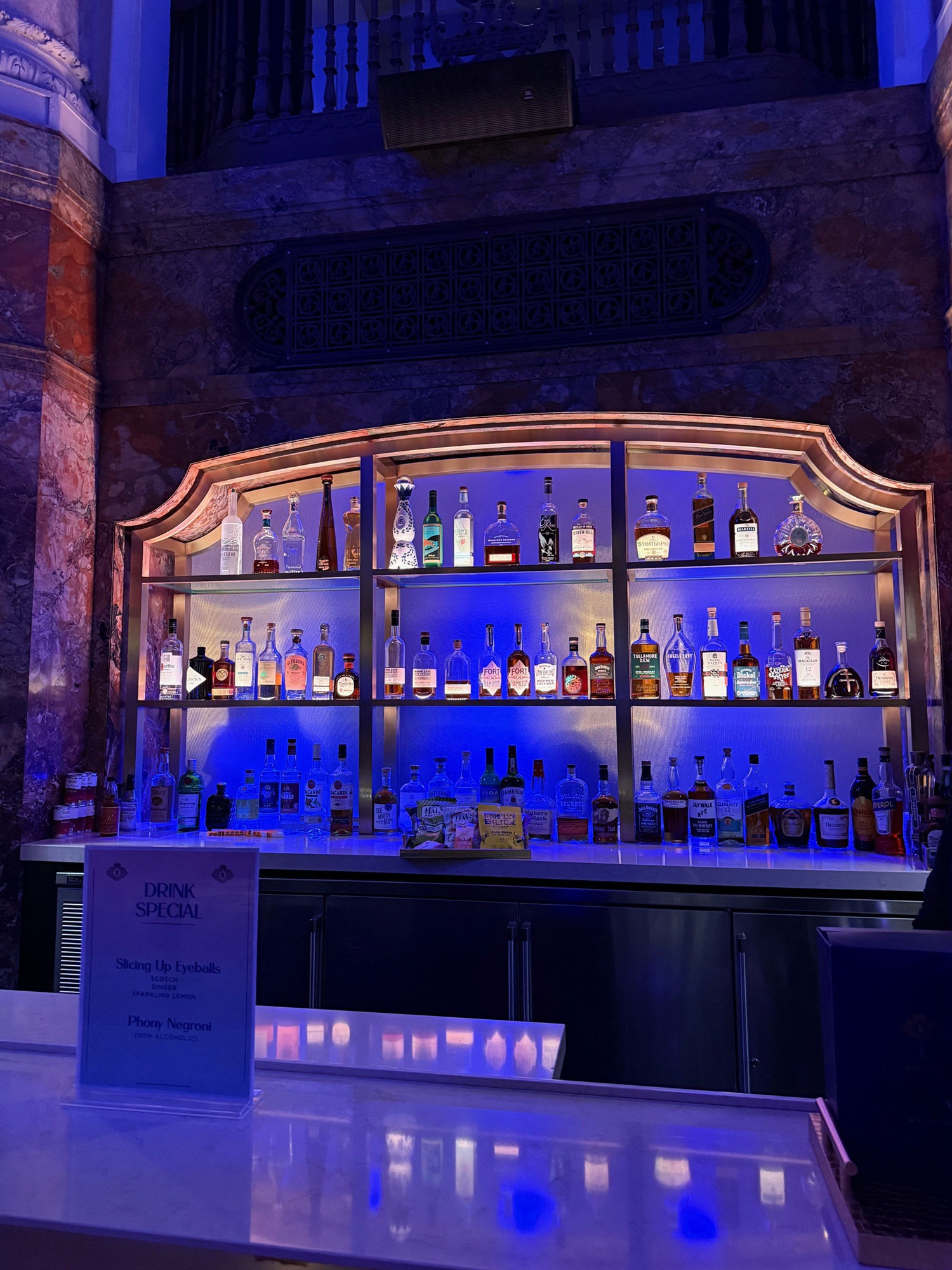 The historic Brooklyn Paramount theater, a launchpad for jazz legends like Ella Fitzgerald, recently underwent a complete interior renovation. The Grand Foyer of the theater serves as an excellent location for socializing with the addition of an opulent bar. The back walls of the bar are made of an colorful textured glass by Bendheim. The rich blue hue of the glass adds an elegant splash of color to the space, while the brass wire in the glass matches the other finishes of the bar.