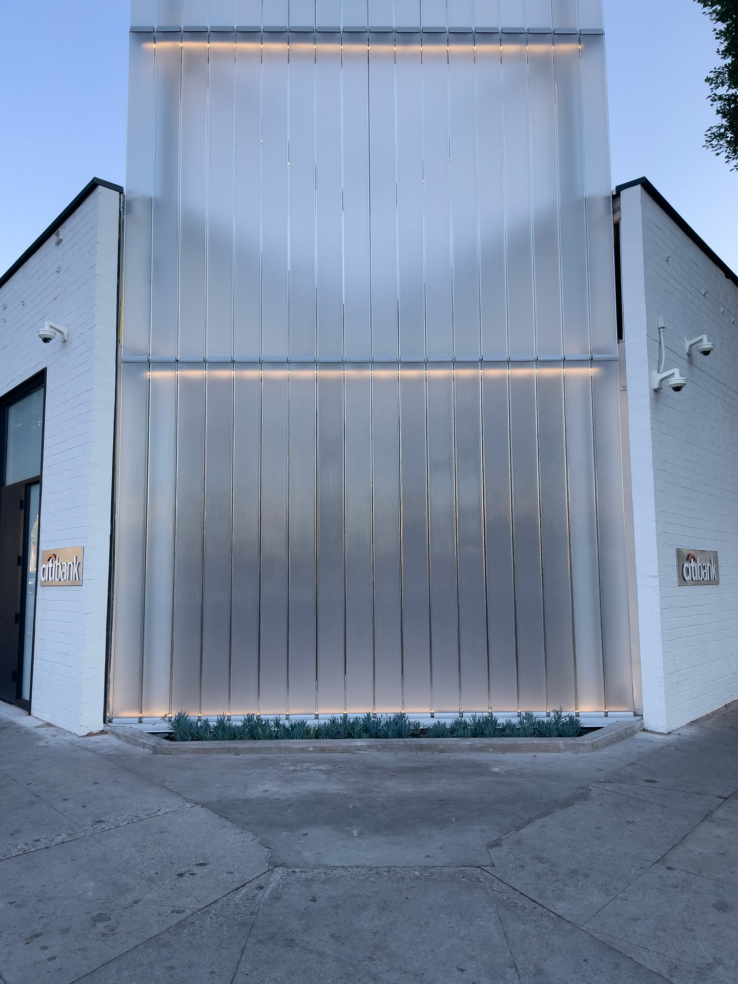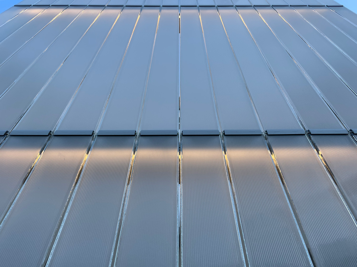 Bendheim’s channel glass, with the deep fluted Prismasolar™ surface texture, creates a stunning 34-foot-tall glass feature wall at the exterior corner of this bank. The channels of single glazed glass wall have a slight gap between them, allowing the wall to act as a ventilated screen. The glass channels are held in Bendheim’s Wall-F compression glass fittings, as opposed to a typical framing system, and are back-lit with LED lighting at the top, bottom, and stack joints.