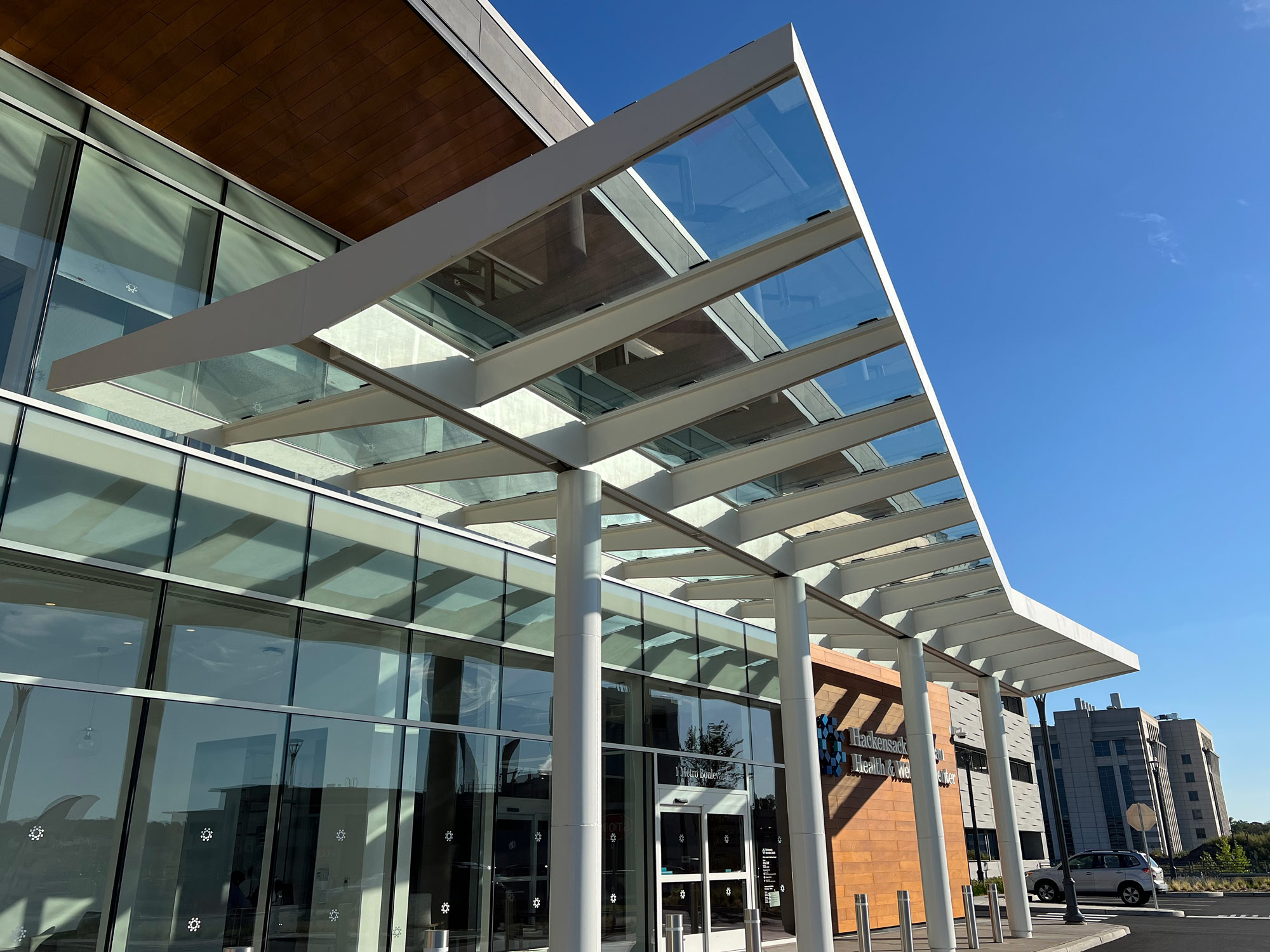 Hackensack Meridian Health’s new Health & Wellness Center features a 65-foot long glass canopy at the facility’s entrance. The project is the first to utilize Bendheim’s GripGlaze™ canopy system. The canopy system holds 26 large glass panels, each 5 feet wide and up to 10 feet in length, and despite the complexity of the glass shapes, the system’s ease of use allowed the team to complete the job quickly and accurately.
