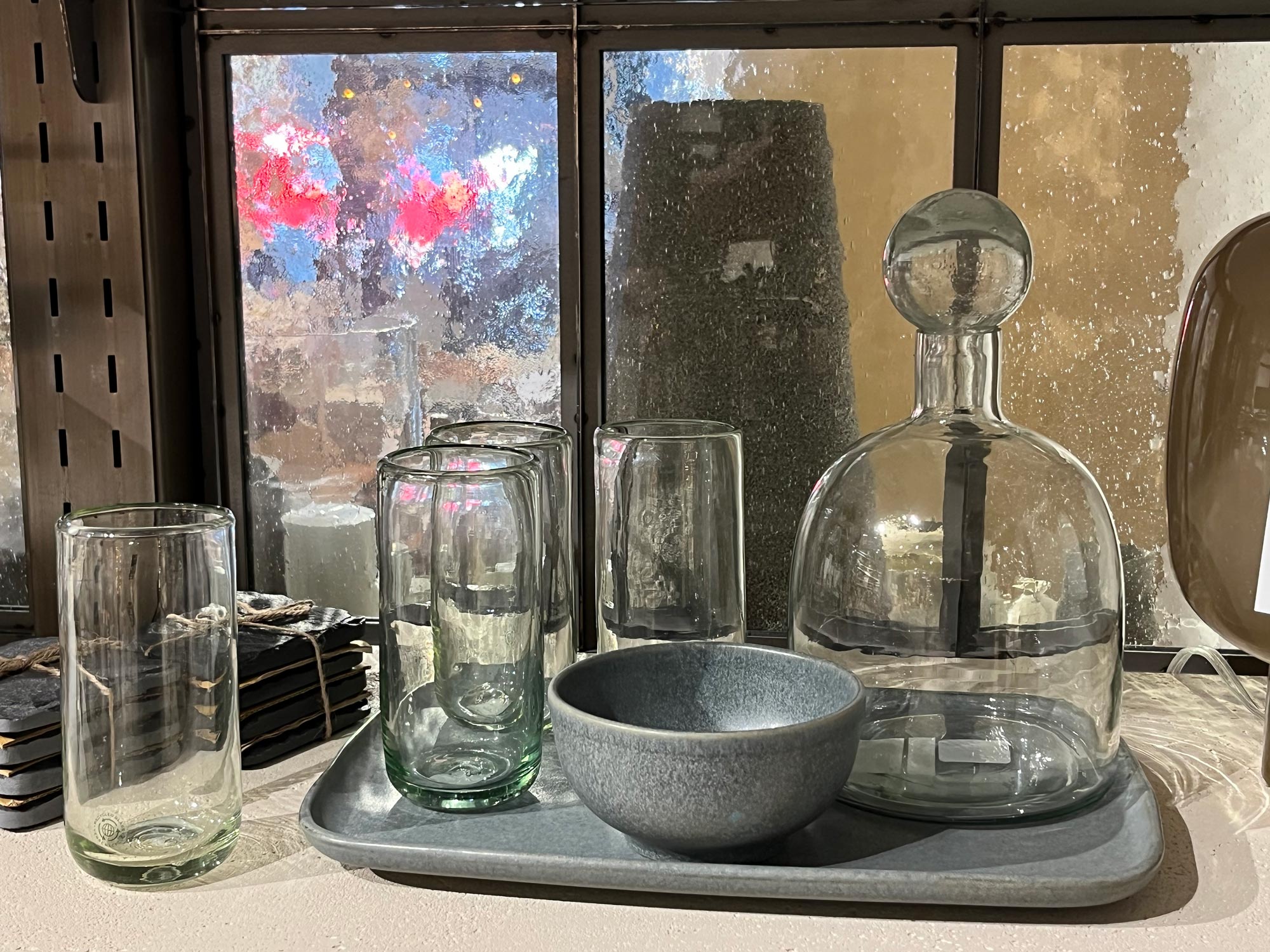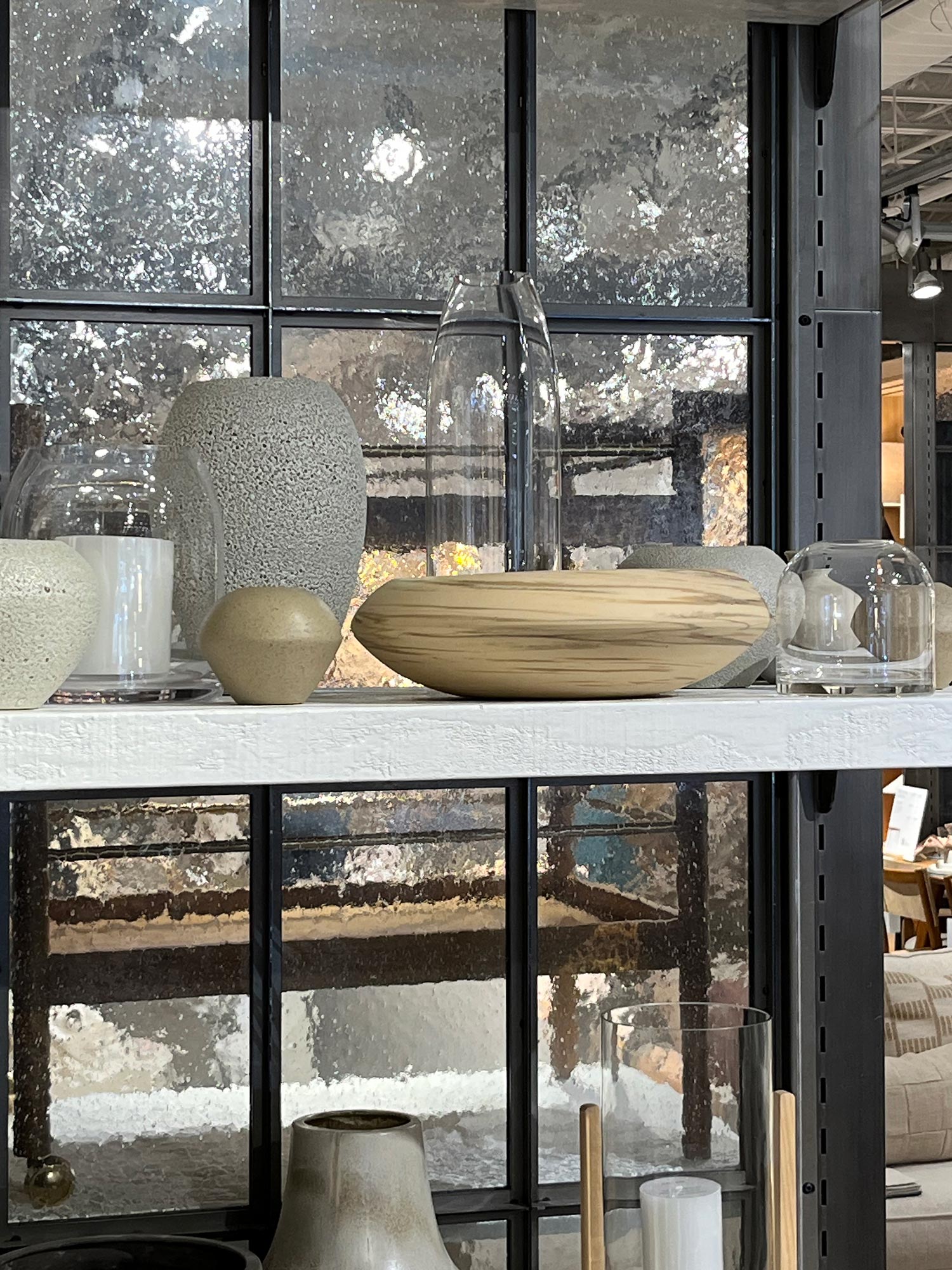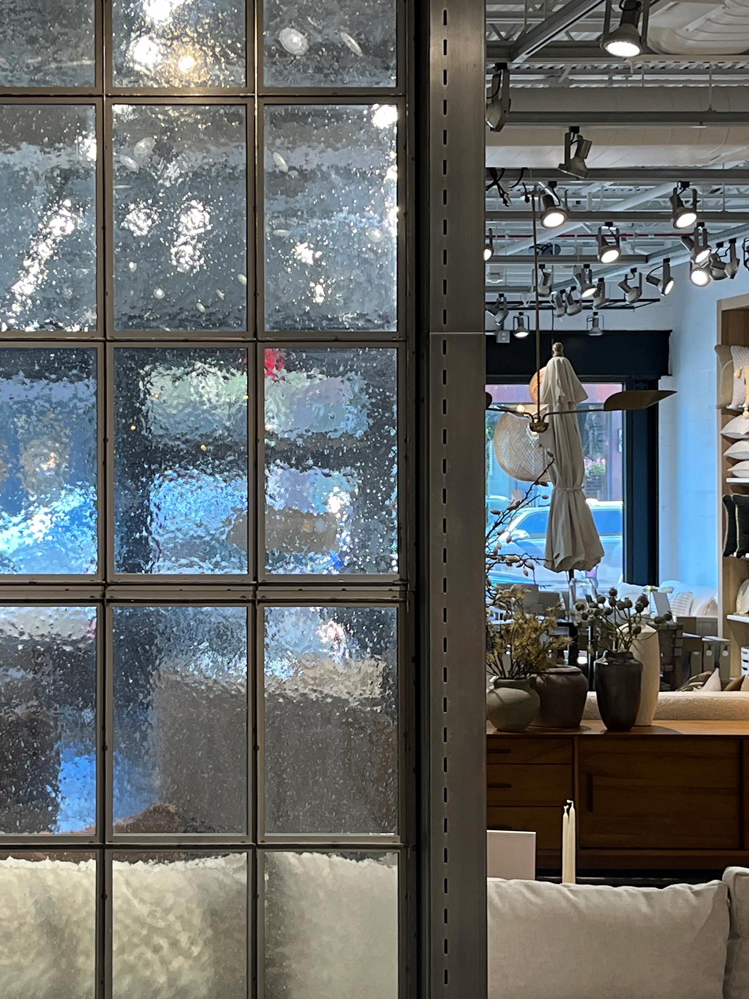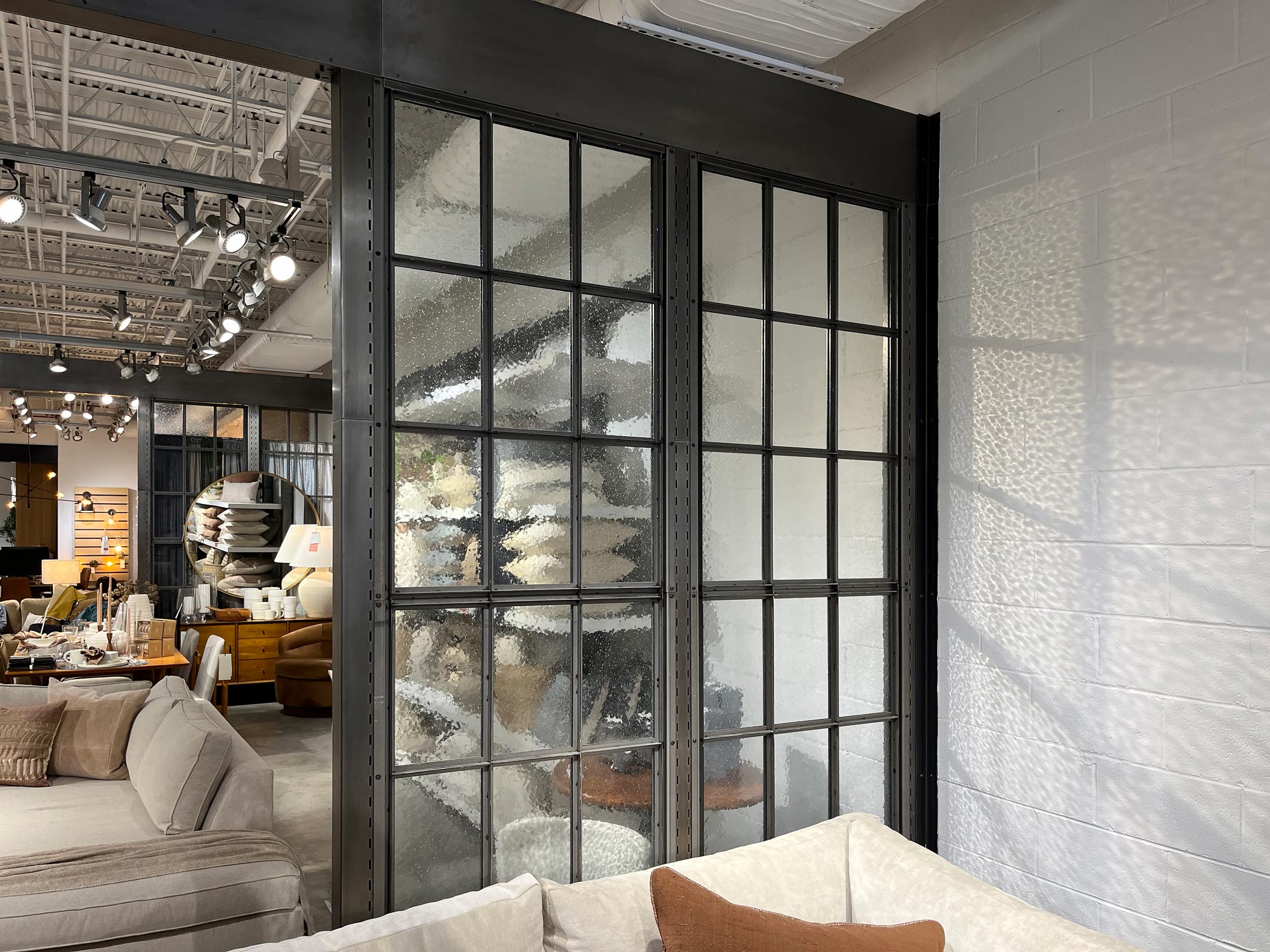 In this luxury furniture and home decor showroom, Bendheim’s textured bubble glass transforms interior partition walls into luminous design features. The softly textured glass diffuses light while maintaining visual separation, creating a refined balance between openness and intimacy throughout the retail space. Set within dark metal framing, the glass adds depth, movement, and a subtle artisanal character, enhancing the shopping experience.