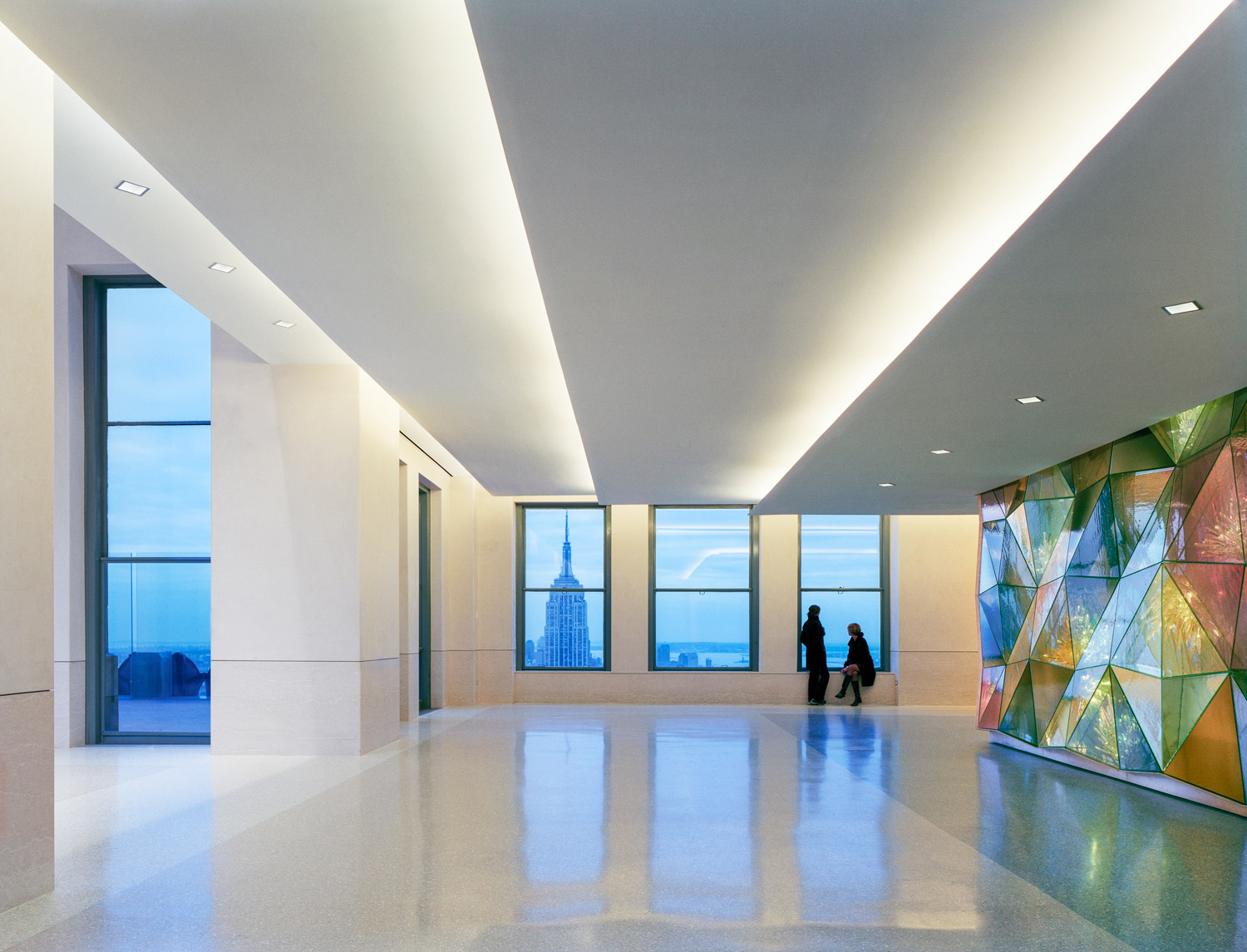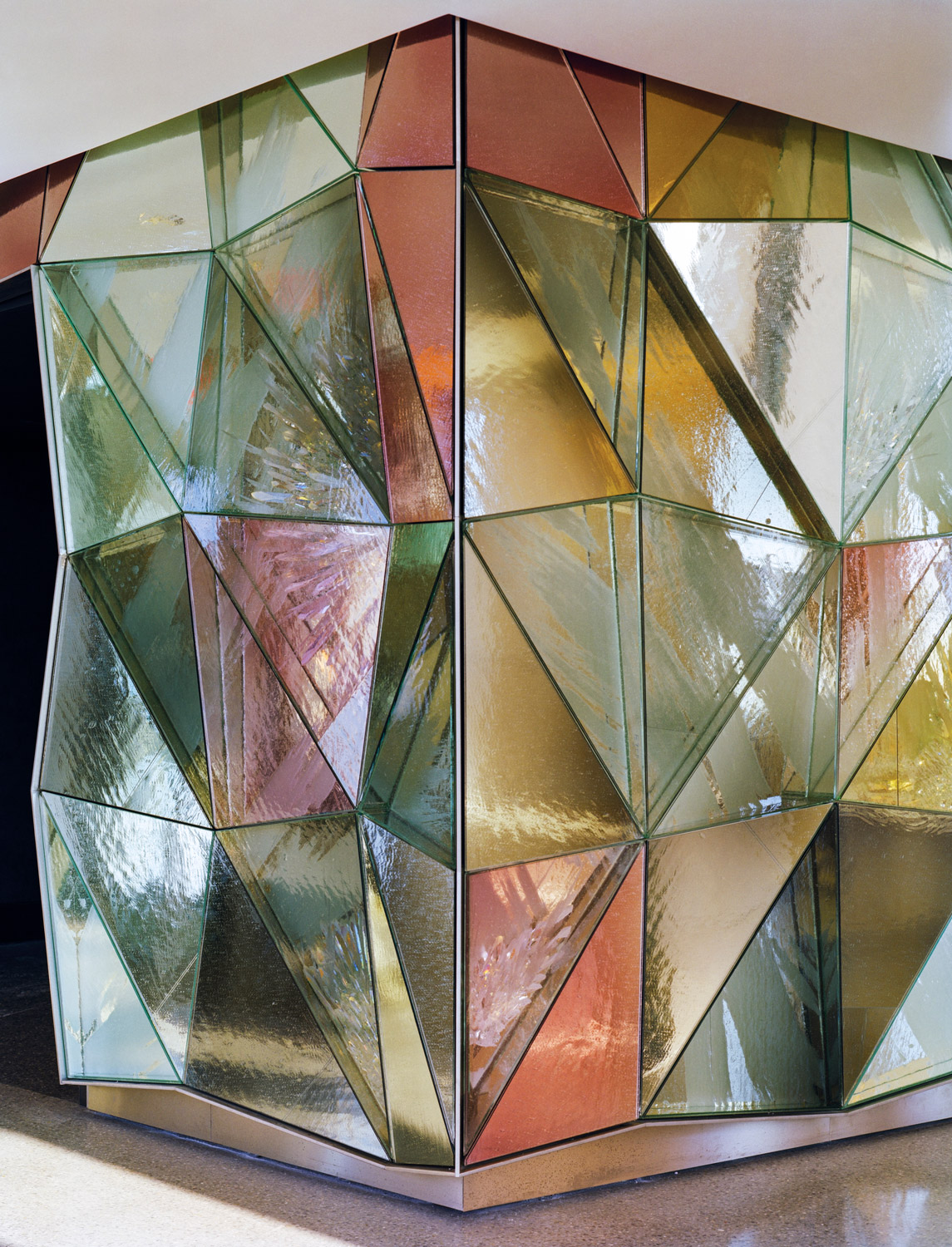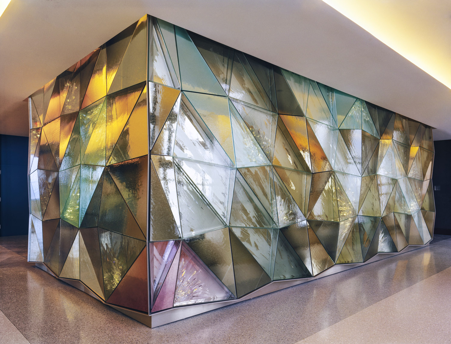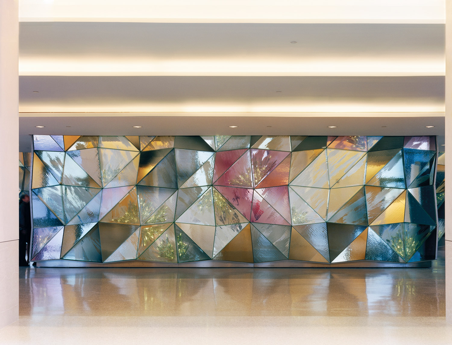 At the Top of the Rock Observation Deck at Rockefeller Center, expansive walls of Bendheim’s Lamberts® mouth-blown glass surround the elevator core. Built to resemble a lighthouse tower, natural daylight adds a dynamic quality as it shimmers across the nearly 600 panels of glass. Fiber optic lights were installed behind the glass to produce a crystalline lighting appearance.